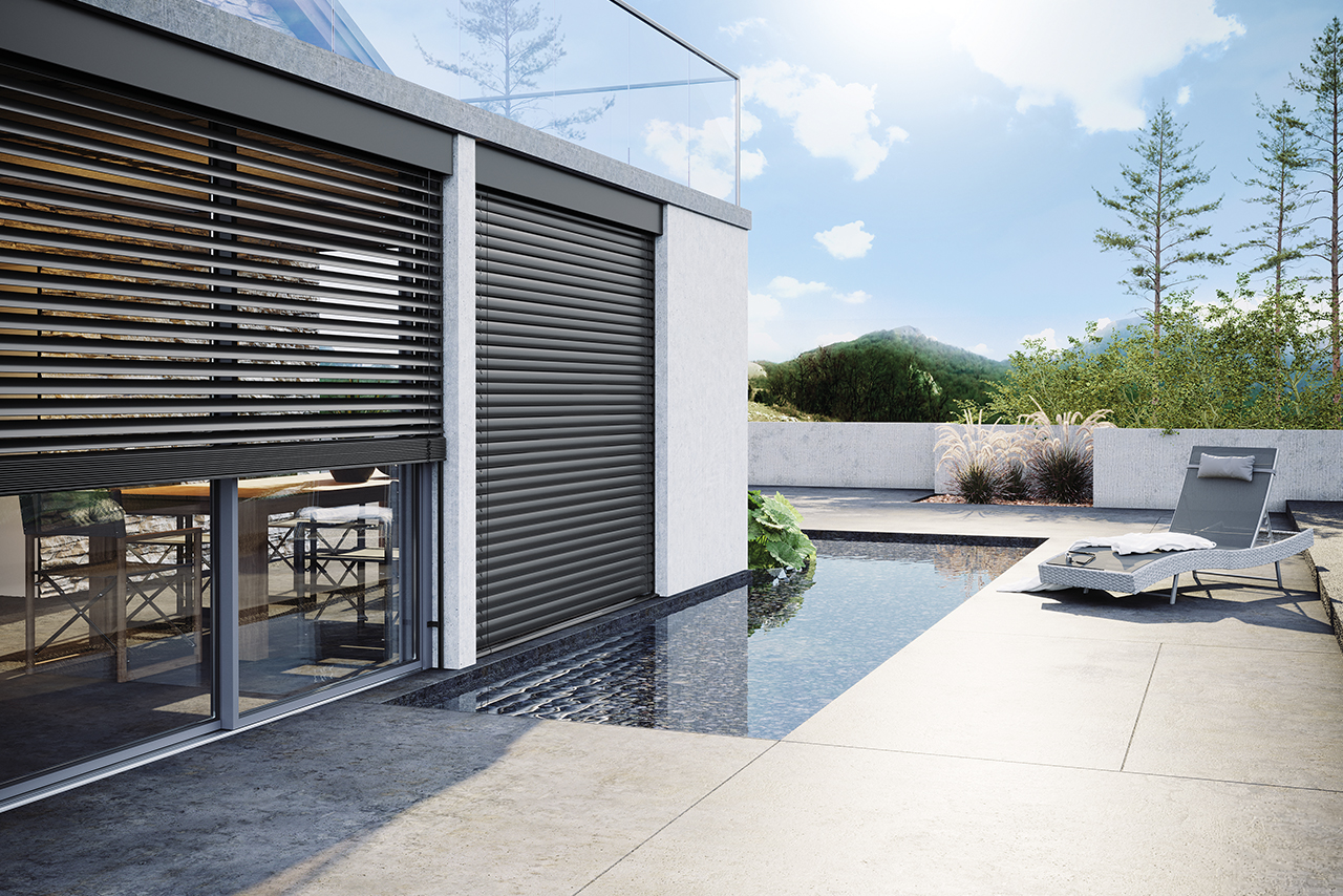 Całość uzupełniają rolety podtynkowe i żaluzje fasadowe sterowane automatycznie – wyposażone w czujnik wiatru, odbiorniki Receiver Modulis Slim RTS i napęd GEIGER GJ56, co gwarantuje bezpieczeństwo i komfort użytkowania nawet przy silnych podmuchach.